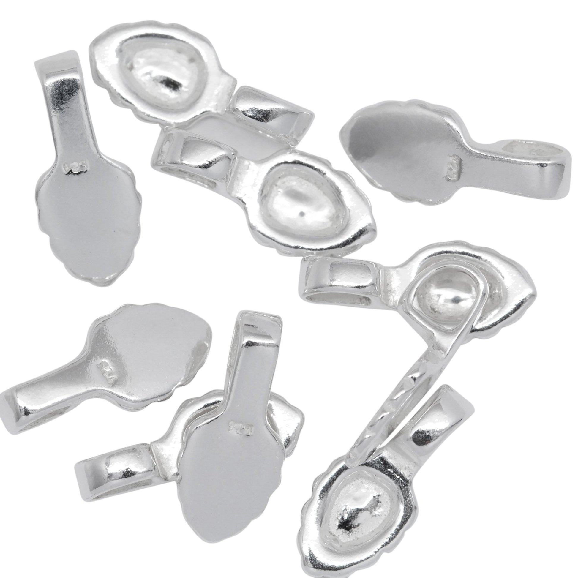 Sterling Silver 5.2mm Width by 7.6mm Height, Glue On Bail with 3.7mm Width by 4.3mm Height, Sliding Bail at the top. Quantity per pack - 10 Pieces.